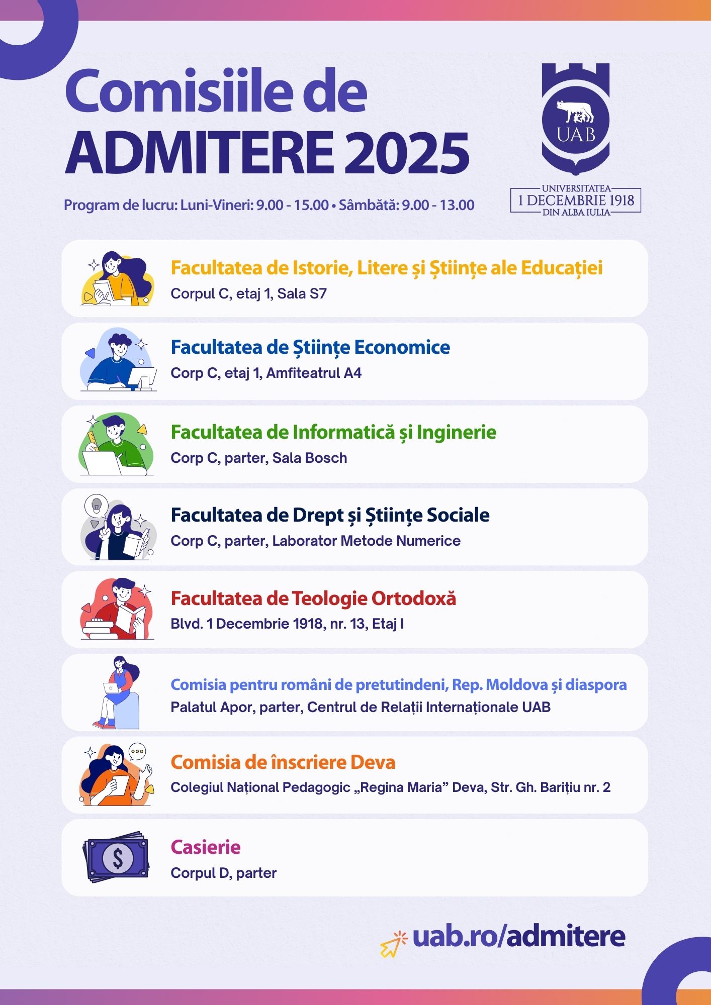 Te așteptăm și fizic la sediul nostru din Alba Iulia - Strada Unirii 15-17, în intervalul orar 9.00-15.00 (luni-vineri) și 9.00-13.00 (sâmbătă) pentru a te înscrie fizic la Admitere 2025 UAB