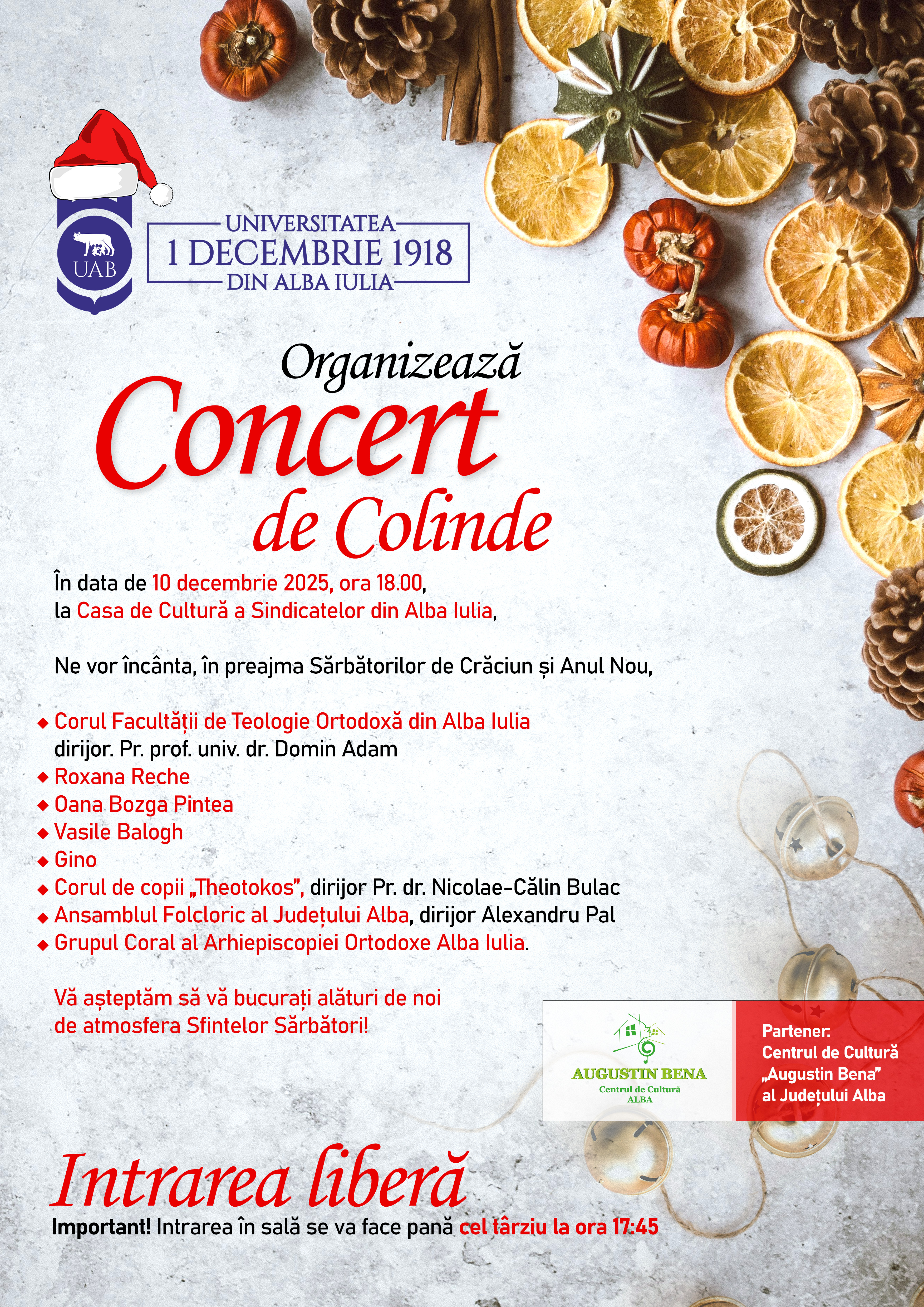Universitatea „1 Decembrie 1918” din Alba Iulia Organizează Concert de Colinde în data de 10 decembrie 2025, ora 18.00, la Casa de Cultură a Sindicatelor din Alba Iulia, Ne vor încânta, în preajma Sărbătorilor de Crăciun și Anul Nou: