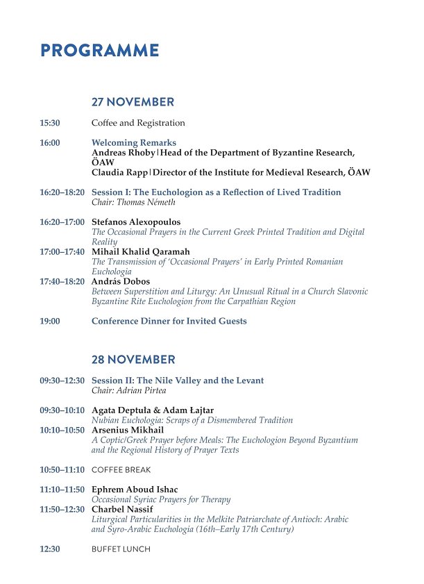 Între 27-29 noiembrie 2025, la Academia Austriacă de Științe din Viena s-a desfășurat conferința internațională „Beyond the Byzantine Euchologion: Priestly Prayers and People’s Concerns in the Christian East”, organizată prin proiectul „Liturgy, Libraries and Learning. The Evidence from Byzantine Euchologia”, al cărui investigator principal este Claudia Rapp. Conferința a reunit cercetători de renume internațional din domeniul Studiilor Liturgice, Bizantinologiei și Studiilor Lingvistice.