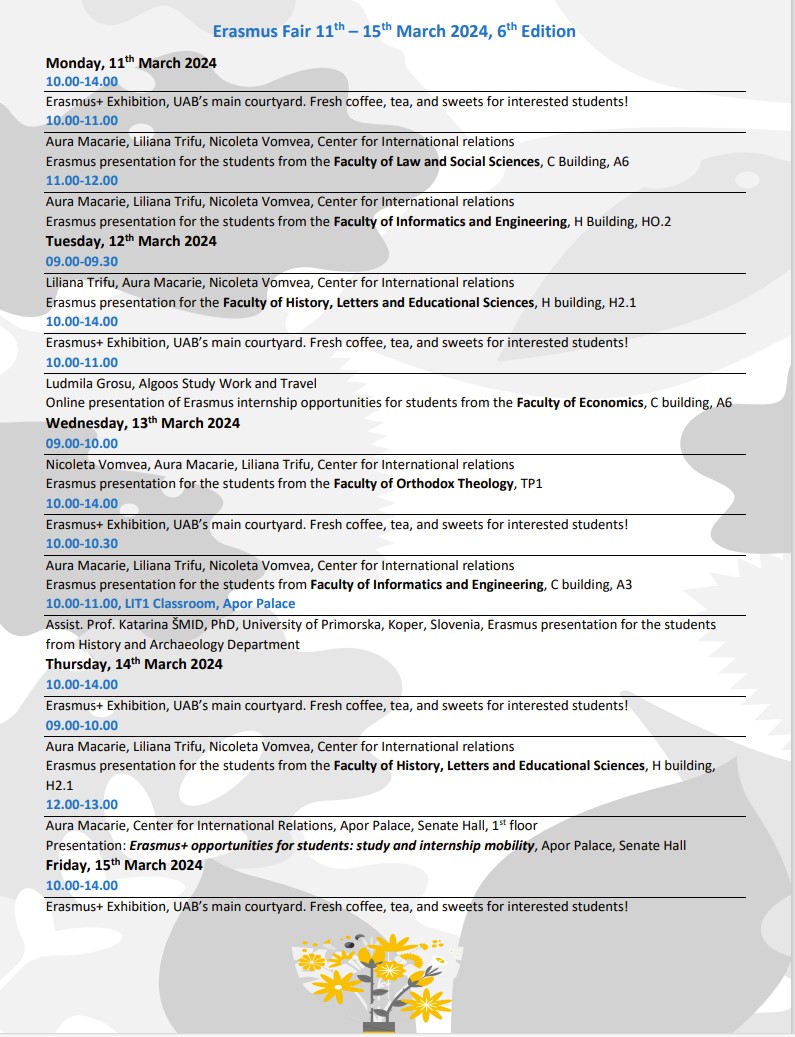 Târgul Erasmus+ al UAB se va încheia vineri, 8 martie 2019, ora 12.00, în curtea principală a universităţii, printr-un moment special care va marca ziua femeii şi începutul primăverii.