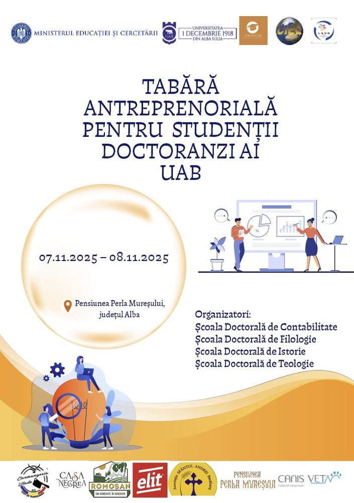 Școlile Doctorale de Contabilitate, Filologie, Istorie și Teologie din cadrul IOSUD al Universității „1 Decembrie 1918” din Alba Iulia organizează, în perioada 7–8 noiembrie 2025, o tabără antreprenorială pentru studenții doctoranzi. Activitățile propuse vor contribui la formarea de competențe antreprenoriale, dezvoltarea gândirii inovative și susținerea inițiativelor de cercetare aplicată în rândul tinerilor cercetători.