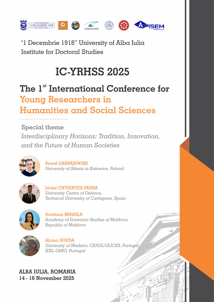 IOSUD-UAB vă invită la prima ediție a Conferinței internaționale a studenților doctoranzi ai IOSUD-UAB - „International Conference for Young Researchers in Humanities and Social Sciences – IC-YRHSS 2025” (14–16 noiembrie 2025), cu tema „Interdisciplinary Horizons: Tradition, Innovation, and the Future of Human Societies”.
