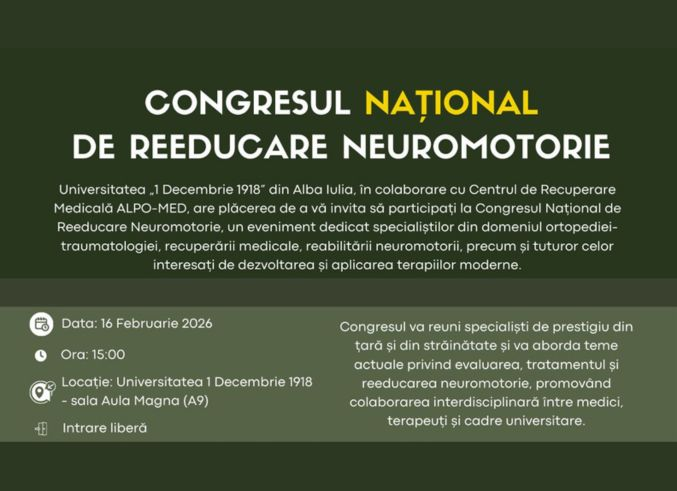 Avem deosebita plăcere de a vă invita la un eveniment medical de referință: prima ediție a Congresului Național de Reeducare Neuromotorie. Organizat de Universitatea „1 Decembrie 1918” din Alba Iulia în parteneriat cu Centrul de Recuperare Medicală ALPO-MED, acest congres este dedicat progresului și inovației în sfera recuperării medicale.